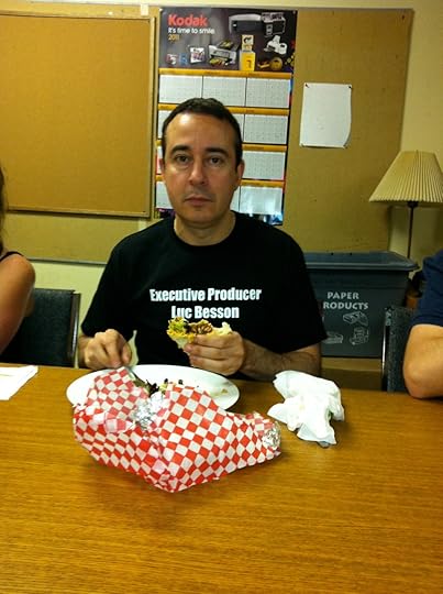 A rare behind-the-scenes pic of yours truly – in this case, enjoying our catered Mexican lunch. Look at how I'm savoring that refried bean wrap!