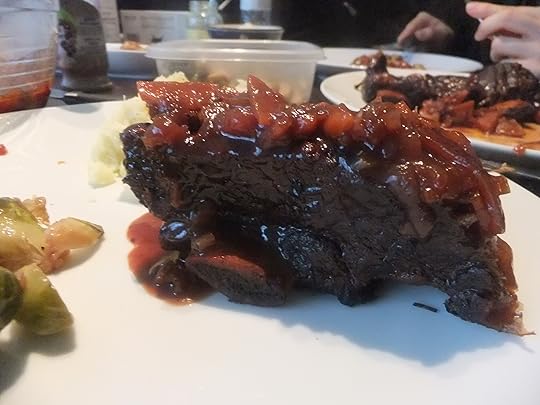 Things were much brighter on the lunch front today. Following a somber offering of pasta so thoroughly cooked that fully fifty percent of blind taste testers would have certainly identified it as wallpaper paste, we got barbecue today!