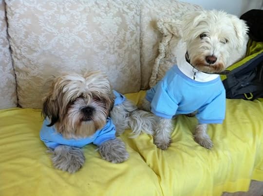 Let's celebrate with a pic of my mother's dog in silly outfits!