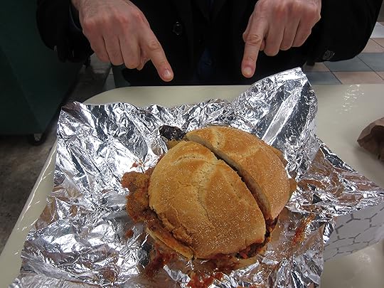 Tomorrow is Carl's last day in town (until he returns to break another story) so we're sending him off in fine style: with schnitzel sandwiches from California Sandwiches and a return trip to m: brgr for dinner. Wish me luck!