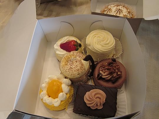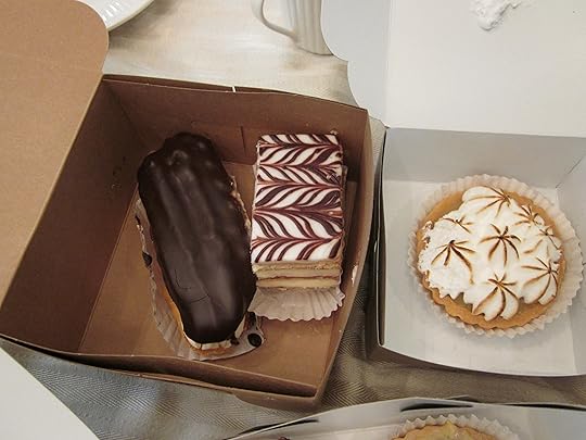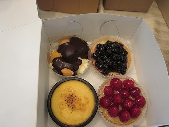 I didn't have time to make ice cream, so I picked up some desserts from that always-busy cake and pastry place in the Granville Island Market. I counted on two pastries each, ten in all, but decided to go for an even dozen. Somehow, I ended up with an extra.
