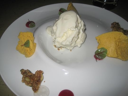 With that minor distraction out of the way, it was time to finish big with not one, not two, not three, but FOUR proper desserts: Pavlova with angel food cake, blood range mousse and papaya in saffron syrup (didn't like the tartness of the mousse); whole wheat chocolate cake with tamarind cream (the surprising subtlety of the cake was overwhelmed by the tartness – yes, again – of the accompanying coulis); baked apple sponge cake pudding with apple pecan ice cream, maple candied bacon, pecans, and raspberry coulis (I can't believe I'm saying this but the bacon was the culprit here – too present in the ice cream and texturally unpleasant); and, my favorite -