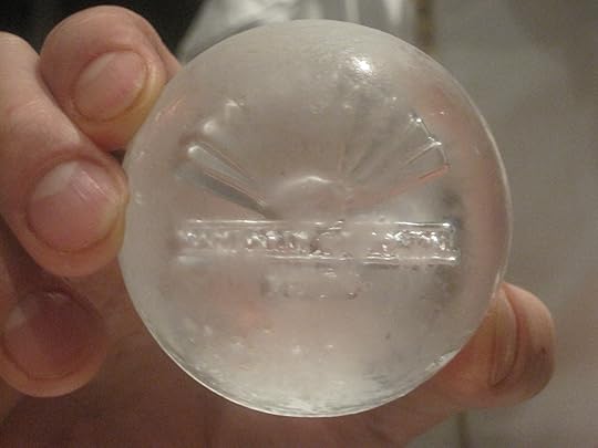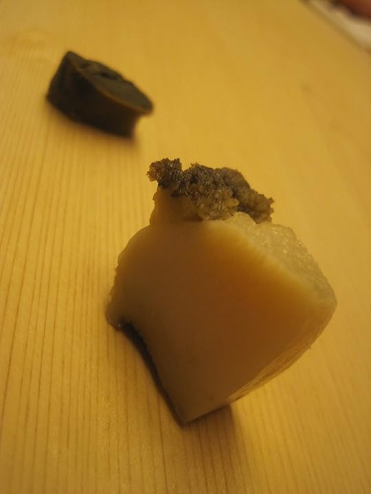 White chocolate kasu truffle (foreground) and kasu-sake ice cream (background).