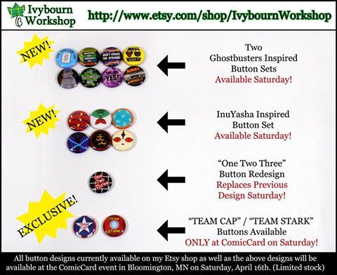 I will be bringing plenty of comics with me, and, as a first, I'll be bringing buttons from my sister's Etsy store -- including the debut of her GHOSTBUSTERS inspired sets, and an exclusive set (we're talking 10 of each design or less) of Captain America: Civil War inspired buttons.