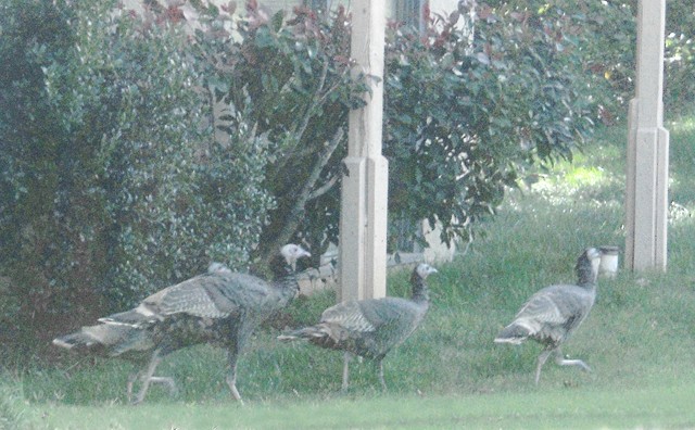My office backs up to a wooded creek, eroded into Permian sandstone to a depth of about ten feet. With the persistant Oklahoma drought the creek is mostly dry, though pools of water exist along its route. This creek and ten acres of undeveloped property nearby is the home for many wild animals. Yesterday, eight wild turkeys were pecking around outside the office. They looked well fed and I suspect someone in the neighborhood is putting out food for them.Eric'sWeb