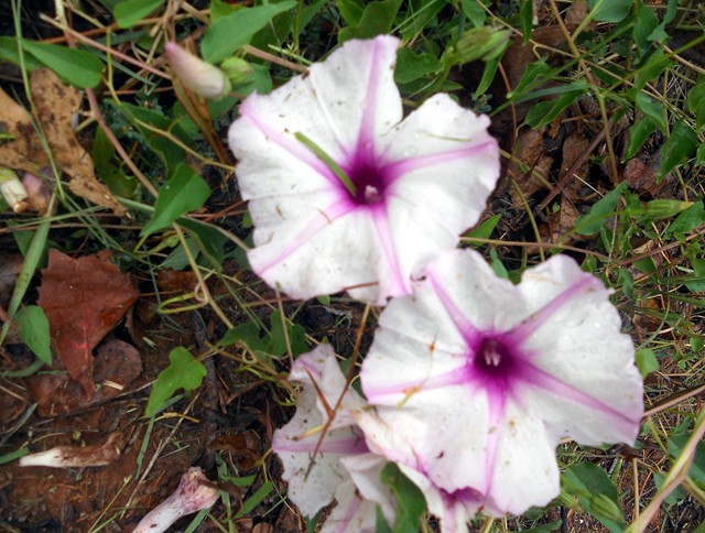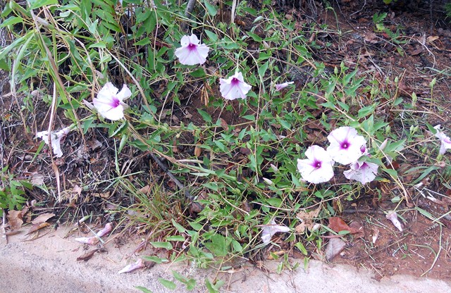 Edmond is the third largest city in Oklahoma. Though mostly urban, there are many wooded creeks and undeveloped areas. My office is near such a creek and undeveloped, wooded area. Last week there were eight wild turkeys outside my office. There is a vine growing near the parking lot that flowers abundantly any time it rains (rare during the past two years of drought conditions here in Oklahoma.) They are bigger than morning glories and look like moonflowers, except they bloom during the day. These flowers were likely planted by some early settler, fifty, maybe a hundred years ago. Maybe someone that left for California on Route 66 during the Dust Bowl days. Does anyone know what they are?