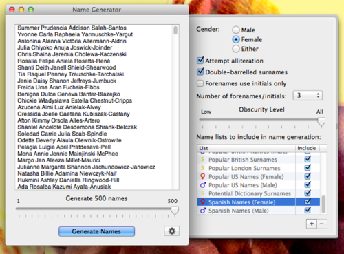 Scrivener has a name generator, and it's awesome. I knew about this feature but never played with it much until today. You can find it in edit…writing tools.