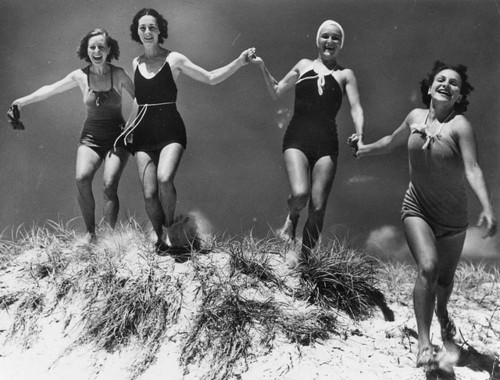 Young women running over a sand dune on an unidentified beach, ca. 1935 by State Library of Queensland, Australia on Flickr.