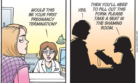In an email with the Guardian, cartoonist Garry Trudeau wrote in regards to the last piece of the cartoon: "That falls within the legal definition of rape. Coercion need not be physically violent to meet the threshold. Many people here are now referring to trans-vaginal sonograms as 'state rape'. That seems about right to me"