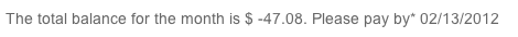 I accidentally overpaid my phone bill last month, so this month I get this line in the bill. If I could offer some editing advice: why not say "The total balance this month is nothing, and you've got $47.08 credit on your account"? How would that not be way more clear than using the same line you'd give me if I did owe you money, just with a little tiny minus sign next to the amount? Also, why do I need to "please pay by" if there's nothing owed? Why doesn't that say "Take it easy until…" and then give the date my balance runs down to zero and I need to pay up again, which is in two months?