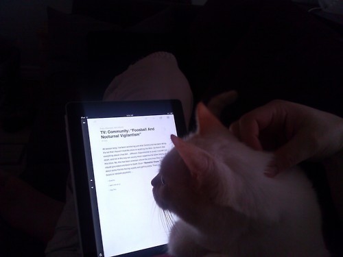 My cat reading Av club's Community recap.