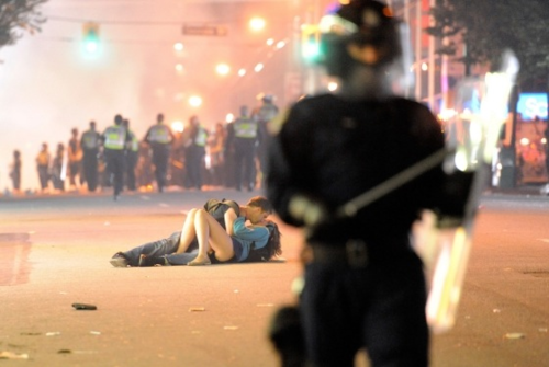 While Canuck fans were expressing their disappointment about losing the Stanley Cup last night via the burning of cars and smashing of windows, one couple decided it was also the perfect time and place for a spontaneous expression of love.