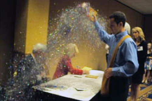 A protester dumped a bunch of glitter on Newt Gingrich and his wife tonight at a book-signing in Minneapolis. The man approached the couple during the event at a downtown Minneapolis hotel and showered the rainbow-colored confetti on the pair. He then yelled, "stop the hate" and "feel the rainbow," presumably a nod to gay rights. Liberal activist Robert Erickson appears to behind the shimmery mess.
