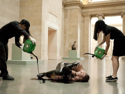 Members of the group Liberate Tate demonstrate at the Tate Britain art gallery in London against oil company BP's sponsorship of arts institutions, and to mark the one year anniversary since the oil spill in Gulf of Mexico. (Photo: AP via the New York Post)