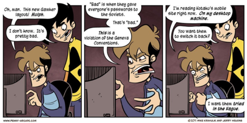 This is how a lot of people feel about Gawker's change. I'm with them. Gizmodo, Lifehacker, and Kotaku all screwed up in my RSS when the changeover happens, and every time I click on a link it asks me if I no longer want to be a member of the site. They're right. I don't.
