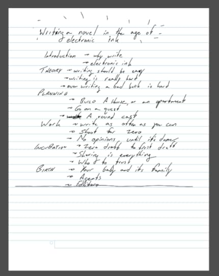 I'm writing the article largely on paper (which makes it ironic), but with an electronic pen that captures everything I write and syncs it to my desktop, (which brings it right back). I've been wanting to write this essay for the better part of two years, but there were always these novels in the way. So here we go.