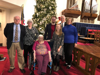 I thought I would share a church tradition with you today! The Chrismon tree. The word Chrismon means "Christ monogram." The tradition got started at the Ascension Lutheran Church in Danville, VA, in 1957. You can read a bit more about it here. It's something that I've really enjoyed at several of our churches over the years. Here's a photo of part of our family (my brother-in-law, sister, mother, son, daughter, hubby, and I'm in the blue) at last year's Christmas Eve service. You can see the Chrismon tree behind us.