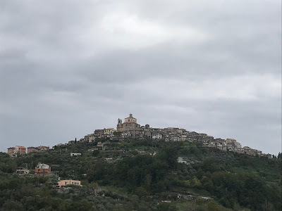 One of the many towns we passed as we traveled through Italy.Our flight to Italy was more than eight hours long and over ten and a half hours on our return flight to the US. My husband and I get up often, drink lots of water and take an aspirin at the start of our trip to help prevent blood clots. Some folks wear knee-high compression socks to keep their legs from swelling. My physical therapist daughter encouraged us to “pump” our feet frequently to help circulation.