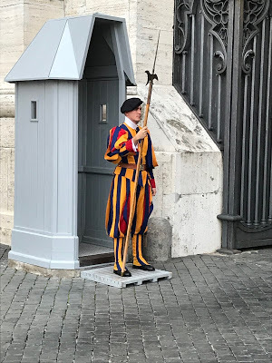A Vatican Swiss Guard. The guards stay at their post fortwo hour stretches. The youngest age to join the guard is 17.International travelers must show their passports frequently in the airport. I have a pouch that hangs around my neck and is large enough for my passport. I wear that neck pouch while flying, and later transfer my passport to a money belt I wear around my waist. I also used a writer’s conference name badge to carry some cash and credit cards around my neck and keep a change purse in my pocket for coins and smaller bills. FYI, make a copy of the photo page of your passport and give one to someone remaining in the US, give another copy to a traveling companion and keep one in your suitcase in case your passport is stolen. We also keep copies of credit card international phone contact numbers.