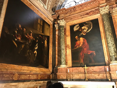 Three beautiful paintings by Caravaggio, a favorite artist of mine, wereon display at the Contarelli Chapel in Rome. The painting on the left