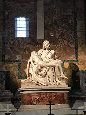 Michelangelo's exquisite Pieta.Before traveling out of the US, notify your credit card company and let them know your travel dates and destination. Check with your phone service about international plans. My AT&T provider offers a $10/day international package with free text and phone calls with charges accrued only on the days used. I took that plan, but ended up relying on “Whats App,” a free download that provides free phone calls, FaceTime and text, including sending photos, to anyone, anywhere in the world as long as they are in the system. My family members downloaded “Whats App” onto their phones, and we talked each day. I sent pictures via text and noted where we were and what we had seen, which provided a running commentary of our travels. The only restriction was that my phone had to be hooked into Wi-Fi before I could call or send texts.