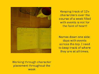 When I look at my 6 novellas that compliment my first book, they all happen simultaneously. I am looking at a period of a week where I have dozen primary characters interacting with each other and, at times, the characters of the featured novel. AND, the dozen primary characters all have their own conflicts and desires that sometimes clash with their love interest and characters not necessarily involved in the novella I’m working on. Do I need to know where all these characters are at all times? Yes, I do!