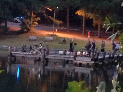 Five large stadium lights were placed around thelake for the middle-of-the-night filming. The first