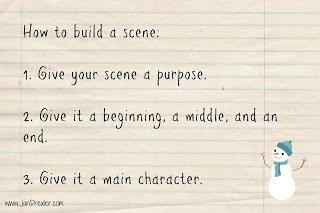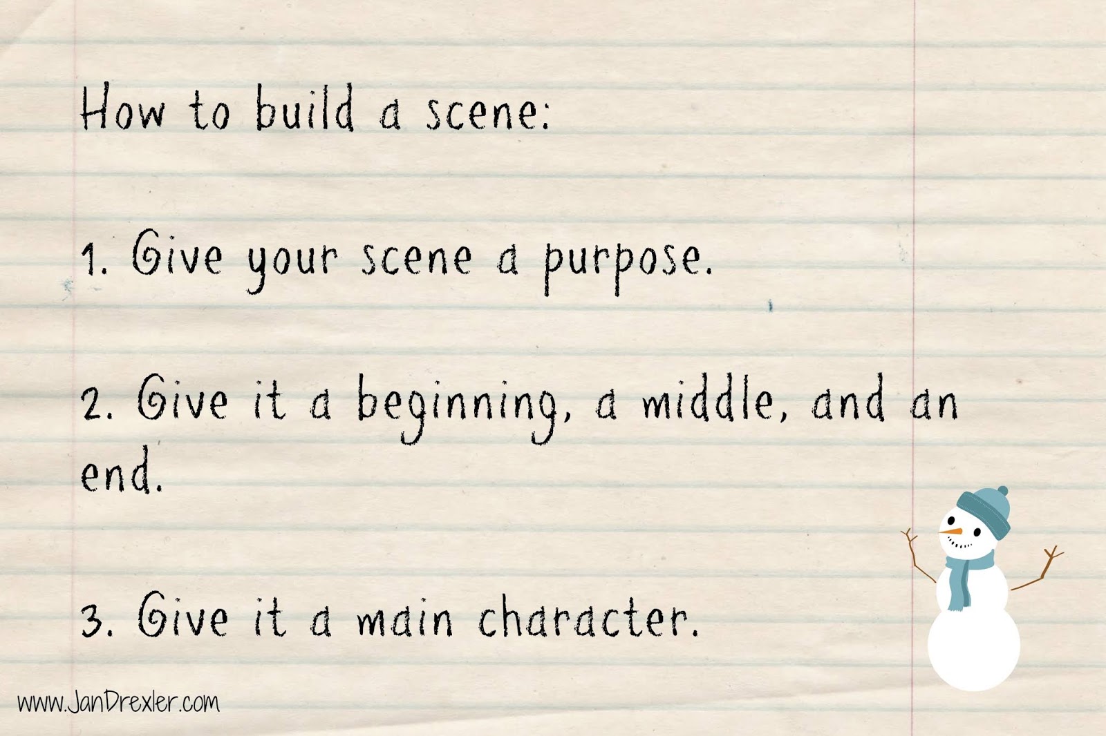 1. Give it a purpose. Scenes aren’t just fluff and filler. Each scene has a role to play to move your story forward from the beginning, through the middle and on to the end. You, as the author, need to know what each scene’s purpose is. That will help you determine how the scene will play out.