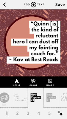 Step 9: Don’t be afraid to use the “Add + Text” option at the top. My first attempt didn’t fit in the space as neatly as I wanted, so I removed the word “Quinn” and thought … uh … outside the box. :) I loved the result (below). Also, if you look closely, I added another “Quinn” in a darker color for a drop shadow. Just because I could. Last, I wanted to give Kav at Best Reads credit, but there just wasn't room inside the small circle. So, I added a third Text box at the bottom. Looking good. :)
