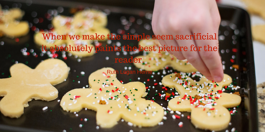 All the feels. I love that. And she’s right. Ever notice how many Hallmark Christmas movies center around towns with extravagant Christmas celebrations.Ruthy had this to say about the other elements of a good holiday story. “Joy, peace, twinkle lights, carols (they either love 'em or hate 'em!!!) faith either shared or born again, realization of the true Christmas story, the real nativity... sacrifice works beautifully in Christmas stories, think "Gift of the Magi", "Little Women" and Jo sacrificing her hair, the things we do from heart... that have little to do with pocketbook. And I love to show "simple Christmas" when folks are low on money. Money doesn't make Christmas. Love does. So paper angels, glittered snowflakes, a single strand of lights, bush trimmings to decorate the manger scene, cutting up old Christmas cards to make new ones... Sugar cookies. Pumpkin bread or cake. When we make the simple seem sacrificial it absolutely paints the best picture for the reader.”