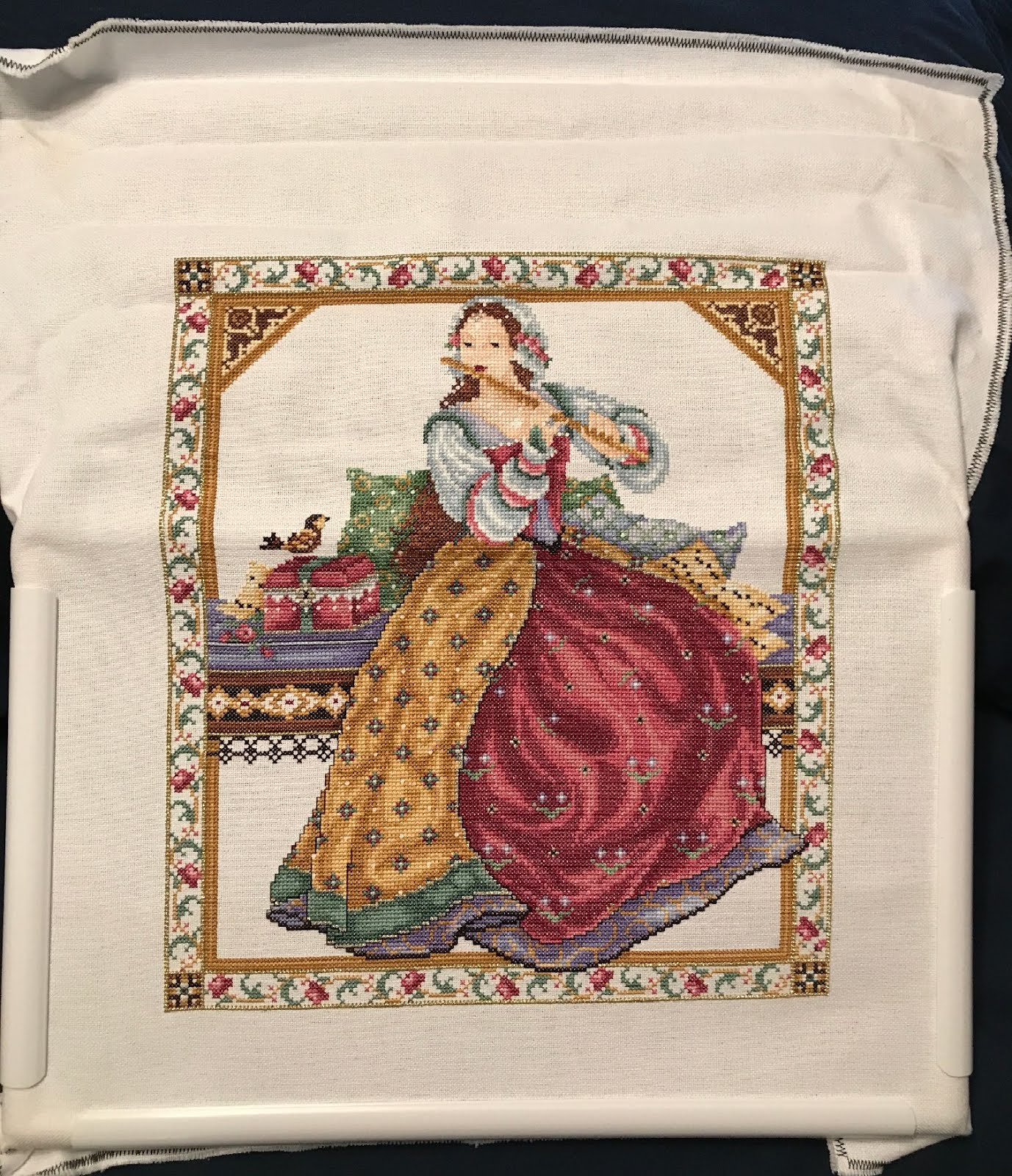Free time? What's that? (Grin) One of my favorite activities is cross-stitching. I enjoy doing counted cross-stitch in the evenings while I watch a show or two on television with my husband. I've been stitching since high school and have many pieces on display around my house. I taught my daughter, and while she doesn't do large projects like I do, she still enjoys stitching small projects for gifts. I'm working on a set of medieval maidens right now that will be a gift to my daughter whenever I get them done (hopefully before another year goes by). One maiden is reading a book and the other is playing a flute. Both she and I played flute and are avid readers, so it just seemed like the perfect set of patterns. I've nearly finished the musician. It still needs backstitching and beads for the finishing touches. Then on to the reader.
