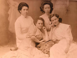 I found that she married Clayton A. Reed, whose death certificate states he was a foster child--so she didn't marry her cousin! Phew. But another interesting tidbit found on Find-A-Grave states that Grace was Clayton's second wife, the first being an "arranged marriage" to the niece of prominent Coppes Kitchens owners, but apparently that didn't work out (that tidbit was not verified, but was researched by another researcher). In another photo, she's pictured (upper left) with friends: Myrtle Eby (lower left) and Pearl & Grace Alexander (right).