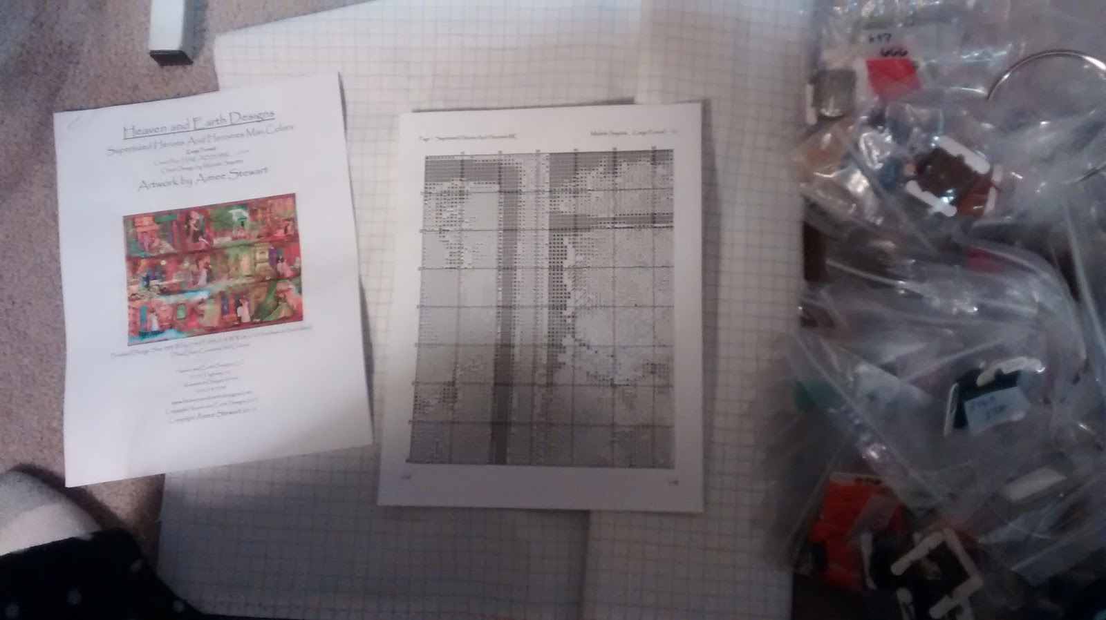 Here's my fabric (see the gray grid lines?) Each of those tiny squares is 100 stitches. Also in the picture is the cover page of the chart with the HAED Logo, the Artist (Aimee Stewart) and a photo of what the piece will look like when I'm finished. I also included an unmarked first page of the pattern. And all those plastic bags on the right? Those are my floss bags. (I've since swapped to a box since it was taking me so much time to find the color I wanted or return the one I had just used to the proper bag.)