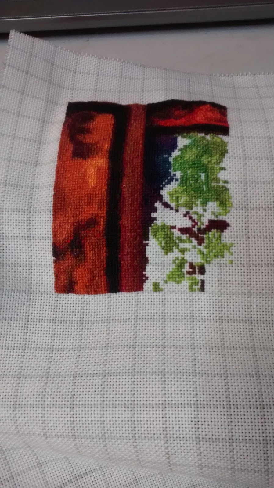 I started in the upper right corner, and it took me awhile to both get used to the tiny stitches and the pattern. I also tried a couple different methods...cross country, where you stitch all of one symbol everywhere on the page, and parking, where you stitch all the symbols of a particular color within a smaller area, then 'park' the thread in the next stitch in the next area and begin a new color in the first, continuing until that small area is finished and moving to the next and picking up the 'parked' threads.