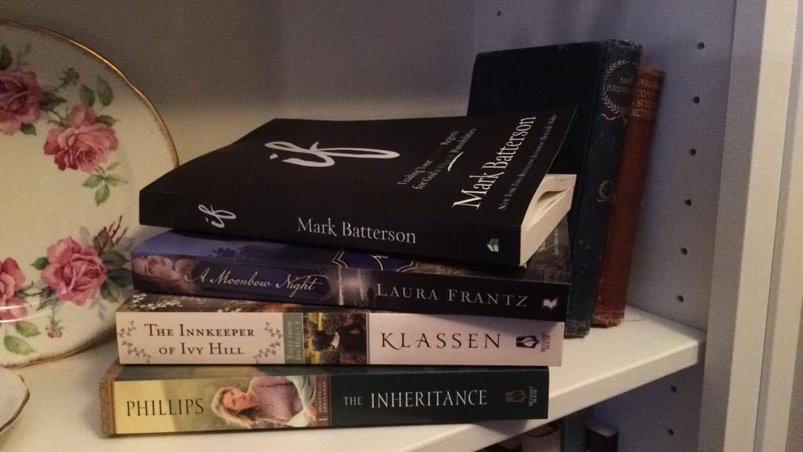 I'm working through Mark Patterson's if while I'm walking on the treadmill in the morning. Laura Frantz's A Moonbow Night just came in the mail last week, and I made a trip to the local bookstore for Klaassen's The Innkeeper of Ivy Hill and Phillips's The Inheritance.