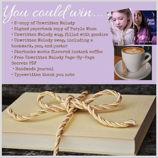 · E-copy of Unwritten Melody· Signed paperback copy of Purple Moon· Unwritten Melody mug, filled with goodies· Unwritten Melody swag, including a bookmark, pen, and poster· Starbucks mocha flavored instant coffee· Free Unwritten Melody: Page-By-Page Secrets PDF· Handmade journal· Typewritten thank you note