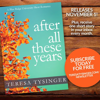 My latest endeavor at writing the & of two characters is After All These Years. Meet Maggie, an author distracted by a crush years in the making. This short story releases November 1 exclusively to my newsletter subscribers, followed by a new short story every month set on the cozy campus of Blue Ridge University, a fictional school in the mountains of North Carolina. These short, inspirational romances about the professors, faculty, students, and townspeople will leave you rooting for true love and sighing with satisfaction. If you’re interested, subscribe for free at http://teresatysinger.com/newsletter.Thanks again to the ladies of CCC for hosting me today. Do you have a You & Me story? An example of how exciting and important “and” is in your life? I’d love to hear about it!