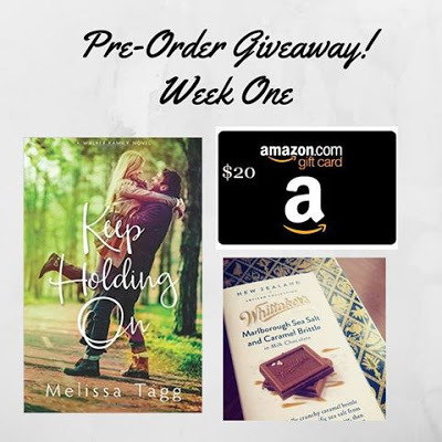 So here we go... Week One. Up for grabs is a copy of Melissa Tagg's fabulous new contemporary romance Keep Holding On, a $20 Amazon Giftcard, a block of my favourite New Zealand chocolate (winners choice of dark, white or milk) and, as a priceless bonus, my eternal gratitude.