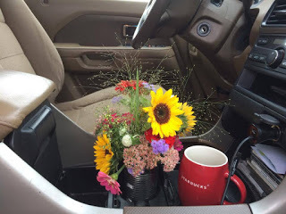 I pulled into the parking lot. Only three cars---and a tent---with three ladies--and a table full of flowers---SUNFLOWERS. My heart surged. I emptied my wallet to buy them, and marveled that the Father cares that much about the little things we'd talked about while drinking coffee together in silence.