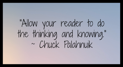 First, I need to change my mindset. I recently read in an essay that “Thinking is abstract. Knowing and believing are intangible. Your story will always be stronger if you just show the physical actions and details of your characters and allow your reader to do the thinking and knowing.” (Nuts and Bolts: “Thought” Verbs by Chuck Palahniuk)