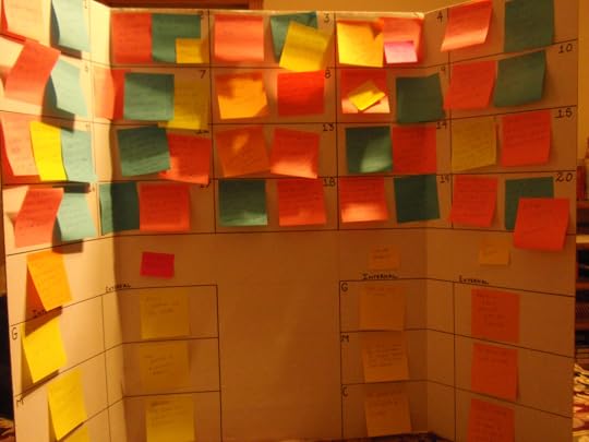 You will need several different colored sticky notes (small enough to fit 2-4 in one square) and a pen or marker. Each note color will represent something different in your book. In the photo example, we used the following colors: (Erica Here: We no longer have access to Pam's original photograph, but from the picture above, you can get the gist.)
