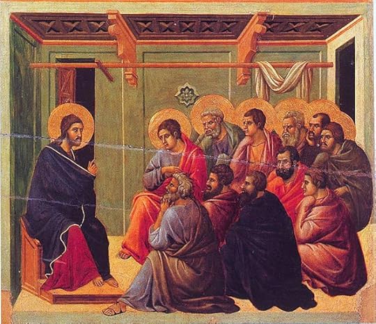 Jesus saying farewell to his eleven remaining disciples, from the Maesta by Duccio, 1308–1311. [PD-US]
