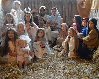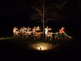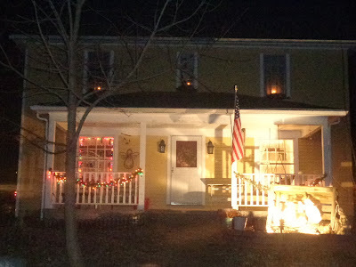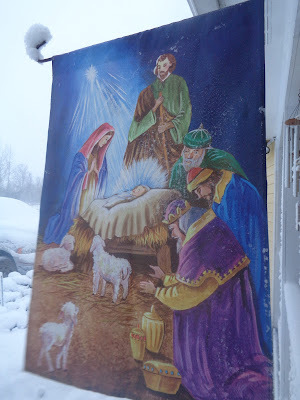 I put out Great-grandma's handmade reindeer and Santa display.... I set up our thirty-year-old resin outdoor Nativity scene. Dave and the kids bought a piece each year for about three or four years... They haven't all weathered well! Kind of like me. They have their aches, cracks and pains, but passers by don't see that. They see the image of a family, struggling, tucked in a stable, having a baby... Lit by ground lights, they light up the night with the hope of Christmas. The meaning of Christmas.