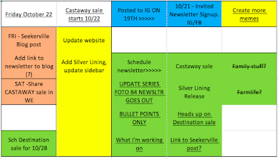 First, either draw off a grid on a piece of paper or use a spreadsheet, which is what I did for these examples. Plan your strategy for whatever project you're working on. For me, this week's target date is/was TODAY and the one topic hinged on Castaway going on sale today.