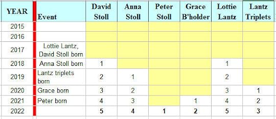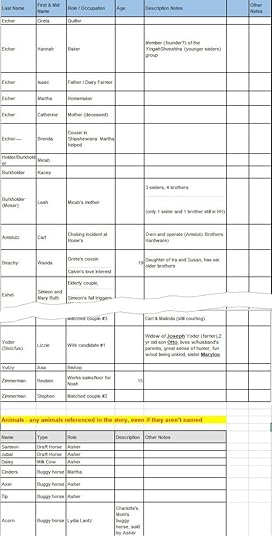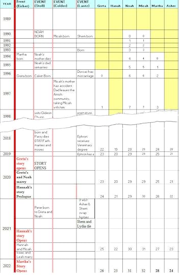 As you can see, I built on this from book to book - necessary because the books are so interlaced through family. So when I created this for the first book, it just had event columns for the Eicher and Stoll families, the age columns for Micah and Asher didn't exist, and the rows ended where it says Greta's story opens. The other information was added as I began work on each book.