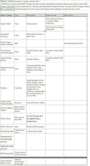 When writing a multi-book series there are a lot of partsand pieces to keep track of – today I thought I’d share a little bit about mypersonal method of doing this. First let me say that I’m a spreadsheet nerd. IfI need to track anything I usually put it in a spreadsheet. So of course that’swhat I use to track all the details of my story world. And let me add that I’llkeep up with a lot of this same info even if it is a standalone book – it savesa lot of time trying to remember what the name of a particular restaurant is orthe street name my hero’s house is on. SO here goes:
