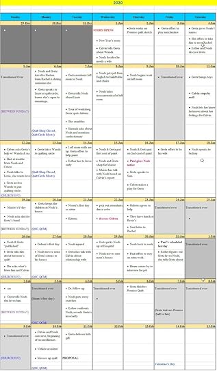 Next I have my story calendar, a day by day chart of what happens when. Having this picture helps me keep up with certain things that are fixed (holidays, church services, standing civic/committee/business meetings, etc.) It also helps me make sure I don't have two Wednesdays in one week or a nine day week or any of the other weird things that can happen if I don't keep up with things. I have one of these for each book