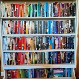 My book sisters (and partners at JustRead Tours) have done beautiful jobs sorting their books by color and gave me permission to share their shelves as examples of how pretty it can turn out!
