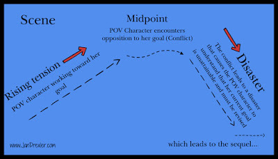 I structure my scenes like a mini book, with a beginning, middle, and an end. I plot the scene with a Goal, Motivation, and Conflict for the POV character, and create the scene with rising tension that comes to a resolution (although not a complete resolution) at the end of the scene. (You can click on the graphic to enlarge it.)