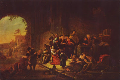 This Parable of the Unmerciful Servant, by Jan van Hemessen, c. 1556, shows the moment when the king scolds the servant. University of Michigan Museum of Art. [PD-US]Peter approached Jesus and asked him,“Lord, if my brother sins against me, how often must I forgive?As many as seven times?” Jesus answered, “I say to you, not seven times but seventy-seven times. That is why the kingdom of heaven may be likened to a king who decided to settle accounts with his servants. When he began the accounting, a debtor was brought before him who owed him a huge amount. Since he had no way of paying it back, his master ordered him to be sold,along with his wife, his children, and all his property, in payment of the debt. At that, the servant fell down, did him homage, and said, ‘Be patient with me, and I will pay you back in full.’Moved with compassion the master of that servant let him go and forgave him the loan. When that servant had left, he found one of his fellow servants who owed him a much smaller amount. He seized him and started to choke him, demanding, ‘Pay back what you owe.’Falling to his knees, his fellow servant begged him, ‘Be patient with me, and I will pay you back.’But he refused. Instead, he had the fellow servant put in prisonuntil he paid back the debt. Now when his fellow servants saw what had happened,they were deeply disturbed, and went to their master and reported the whole affair. His master summoned him and said to him, ‘You wicked servant! I forgave you your entire debt because you begged me to. Should you not have had pity on your fellow servant, as I had pity on you?’Matthew 18:21-35